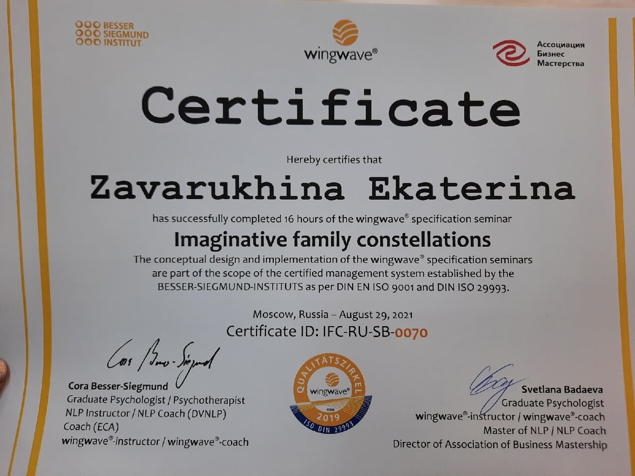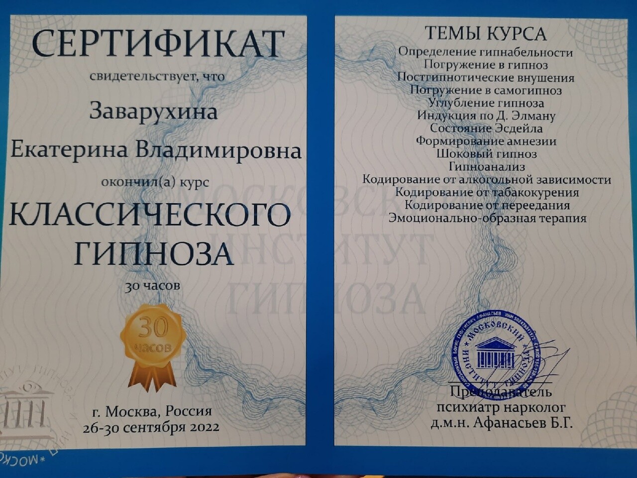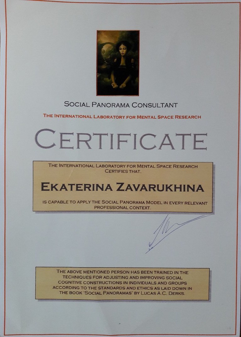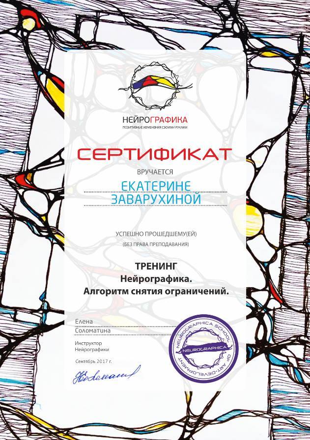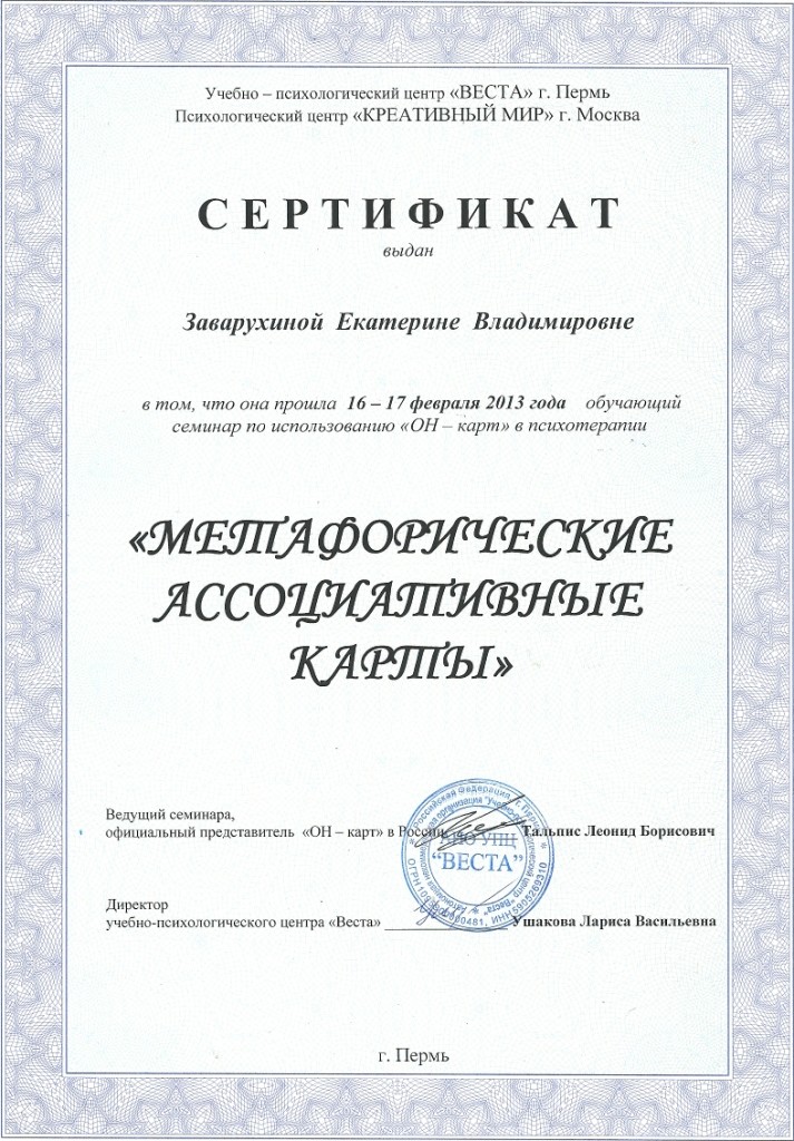Я закончила тренинг "Метафорические карты в коучинге и психологии" от Екатерины ЗАварухиной в консультационно-тренинговом центре "Нить судьбы" и получила сертификат.