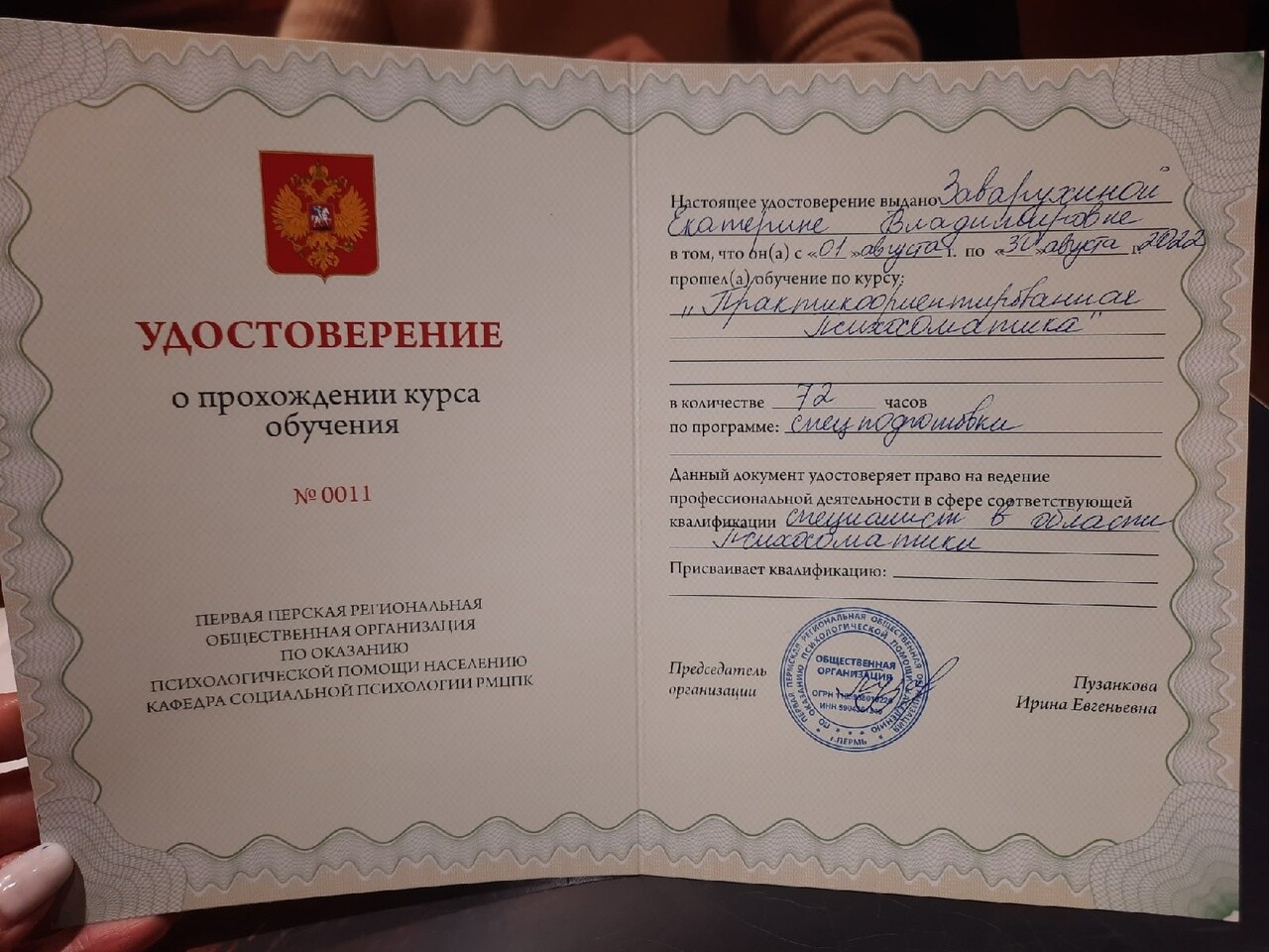 Более 13 лет профессиональной практики - психолог, тренер с 2012 года с подтвержденными дипломами, удостоверениями и сертификатами, член ОППЛ, Аккредитованный психолог в СРО Национальной Ассоциации Развития;
