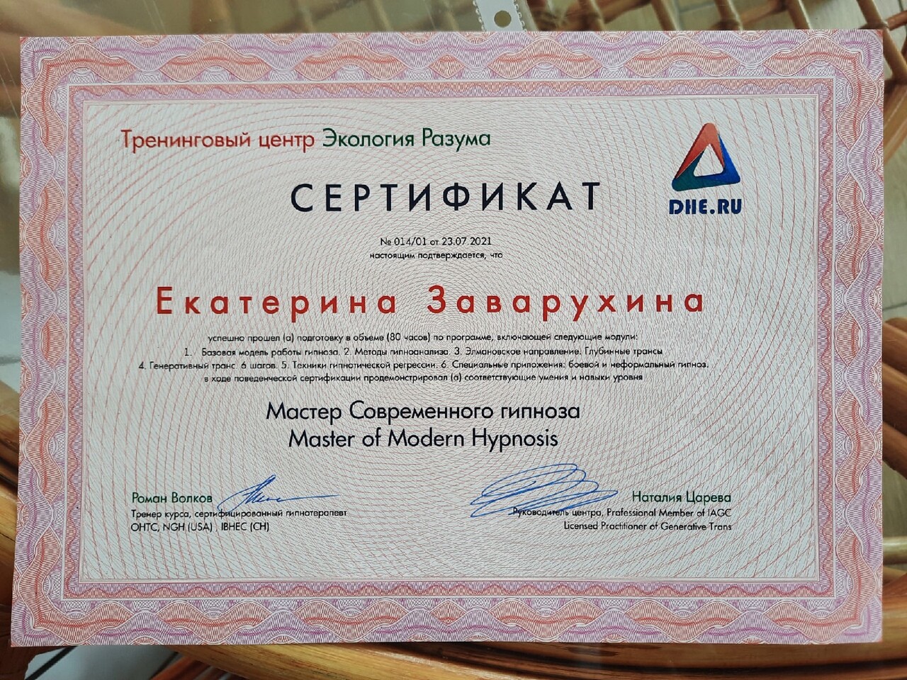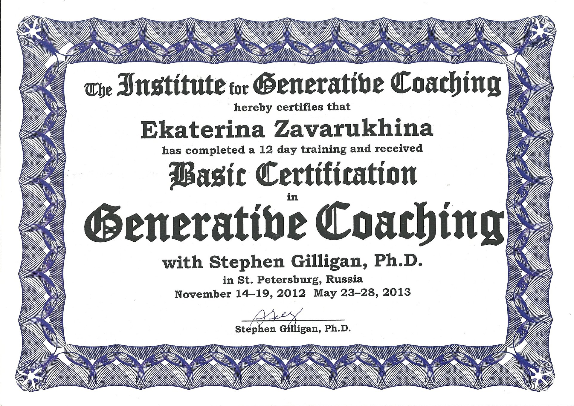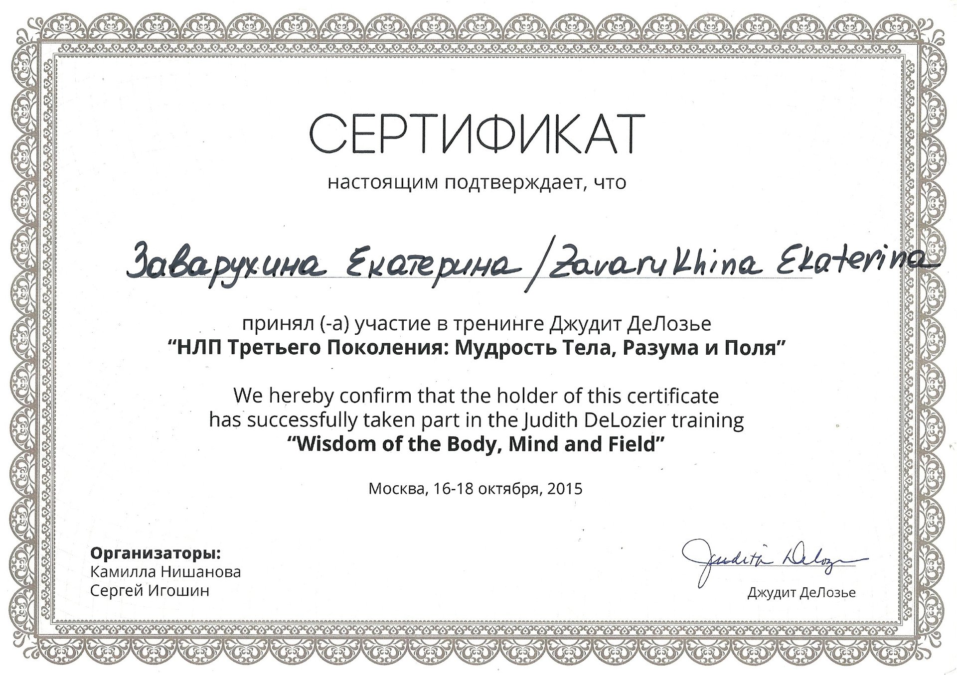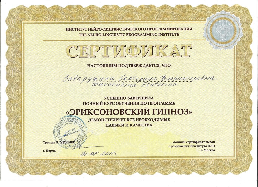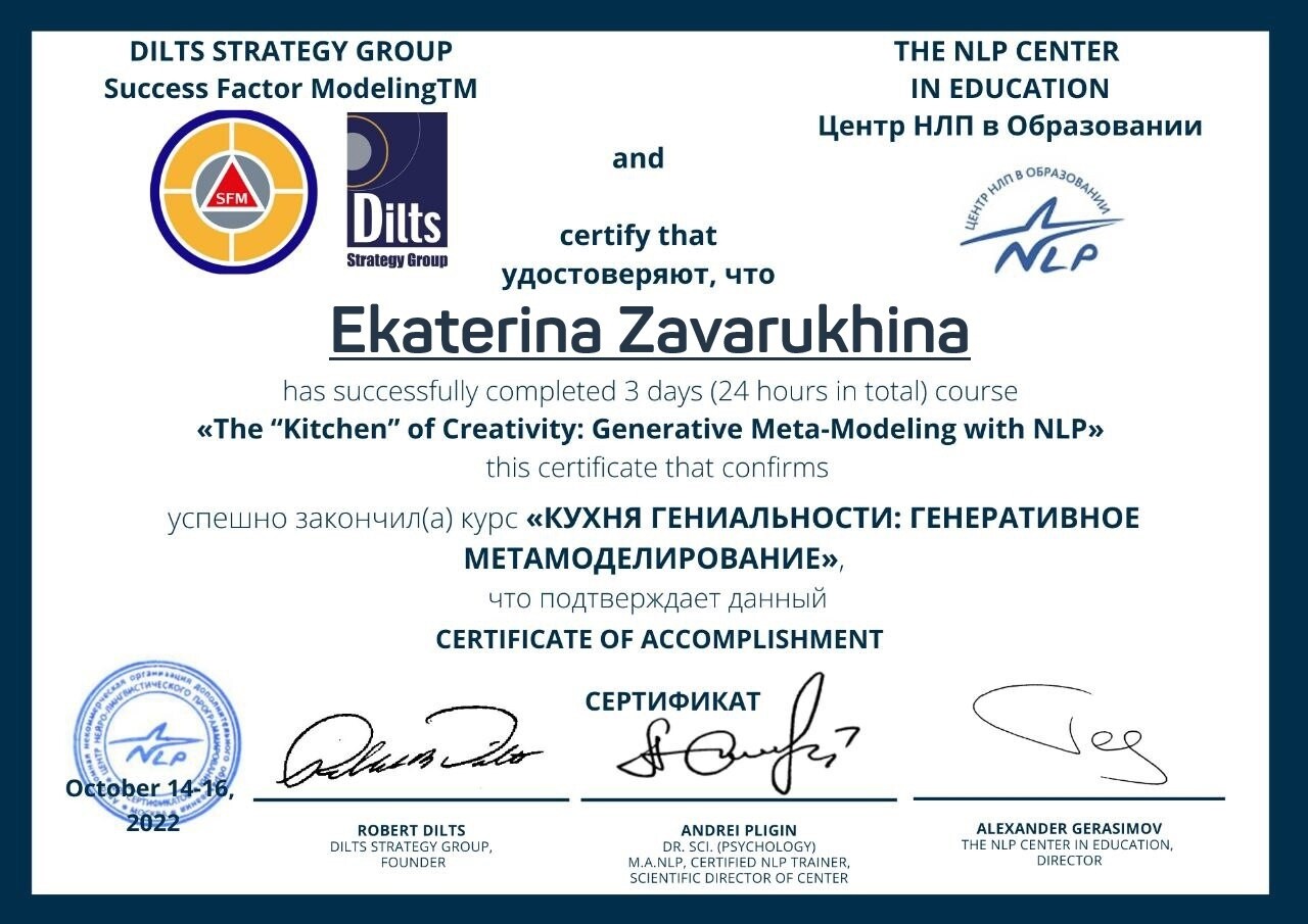 Единственный в Перми тренер НЛП, имею международный тренерский сертификат НЛП от первой леди НЛП - Джудит ДеЛозье и одного из основателей НЛП - Роберта Дилтса (США, Калифорния);