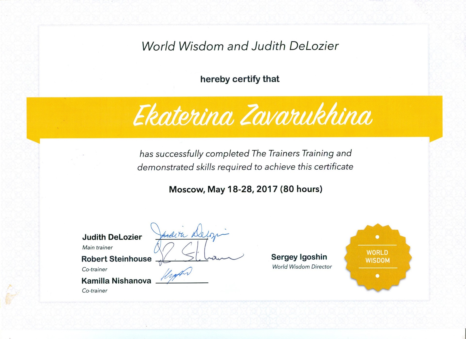 Я закончила тренинг "Метафорические карты в коучинге и психологии" от Екатерины ЗАварухиной в консультационно-тренинговом центре "Нить судьбы" и получила сертификат.